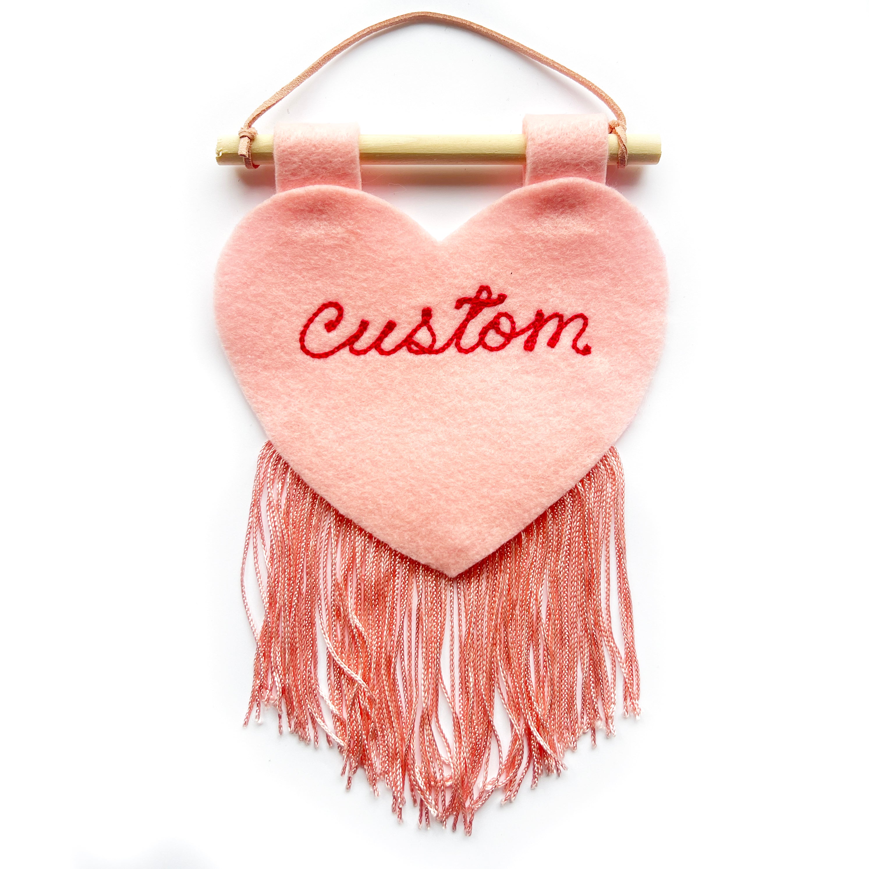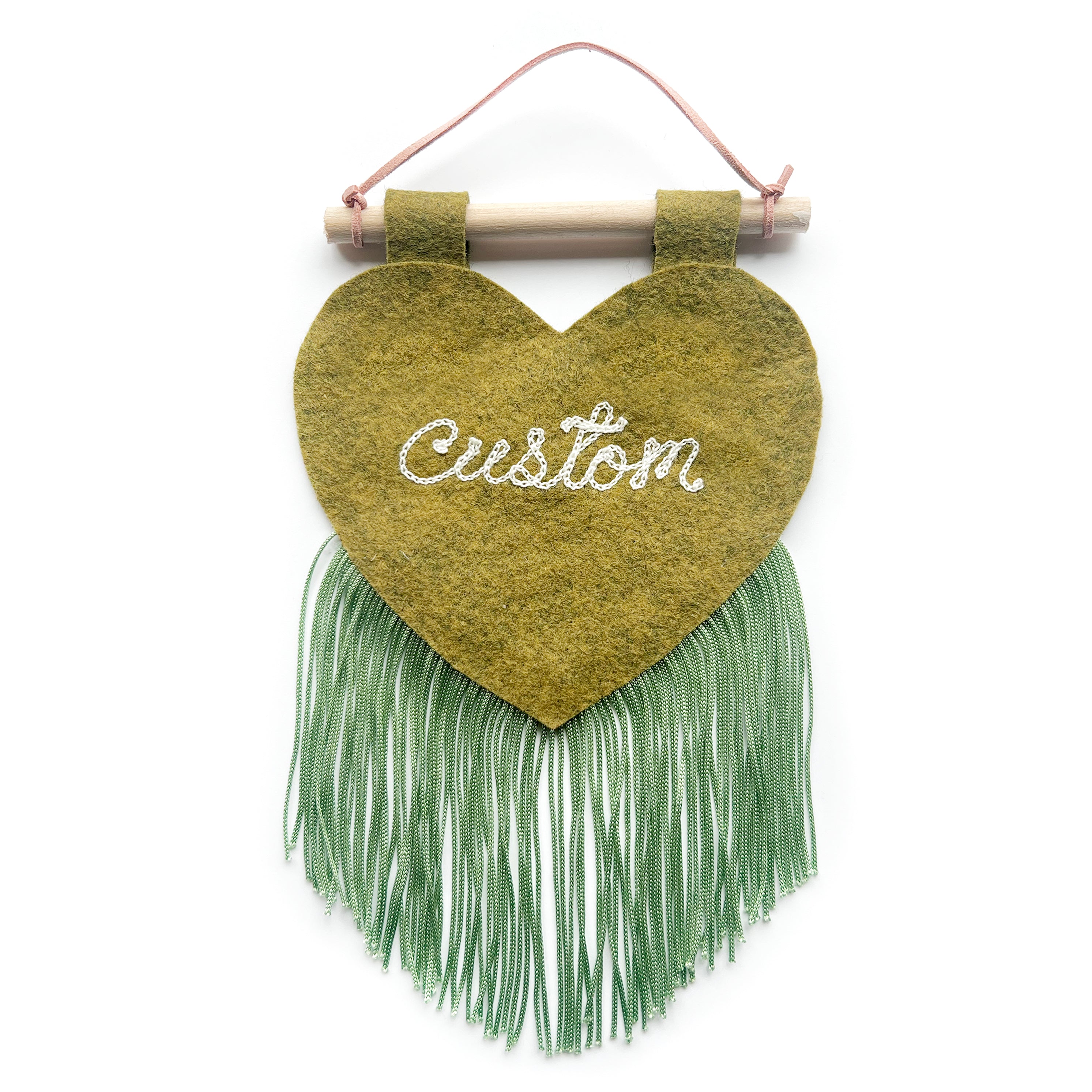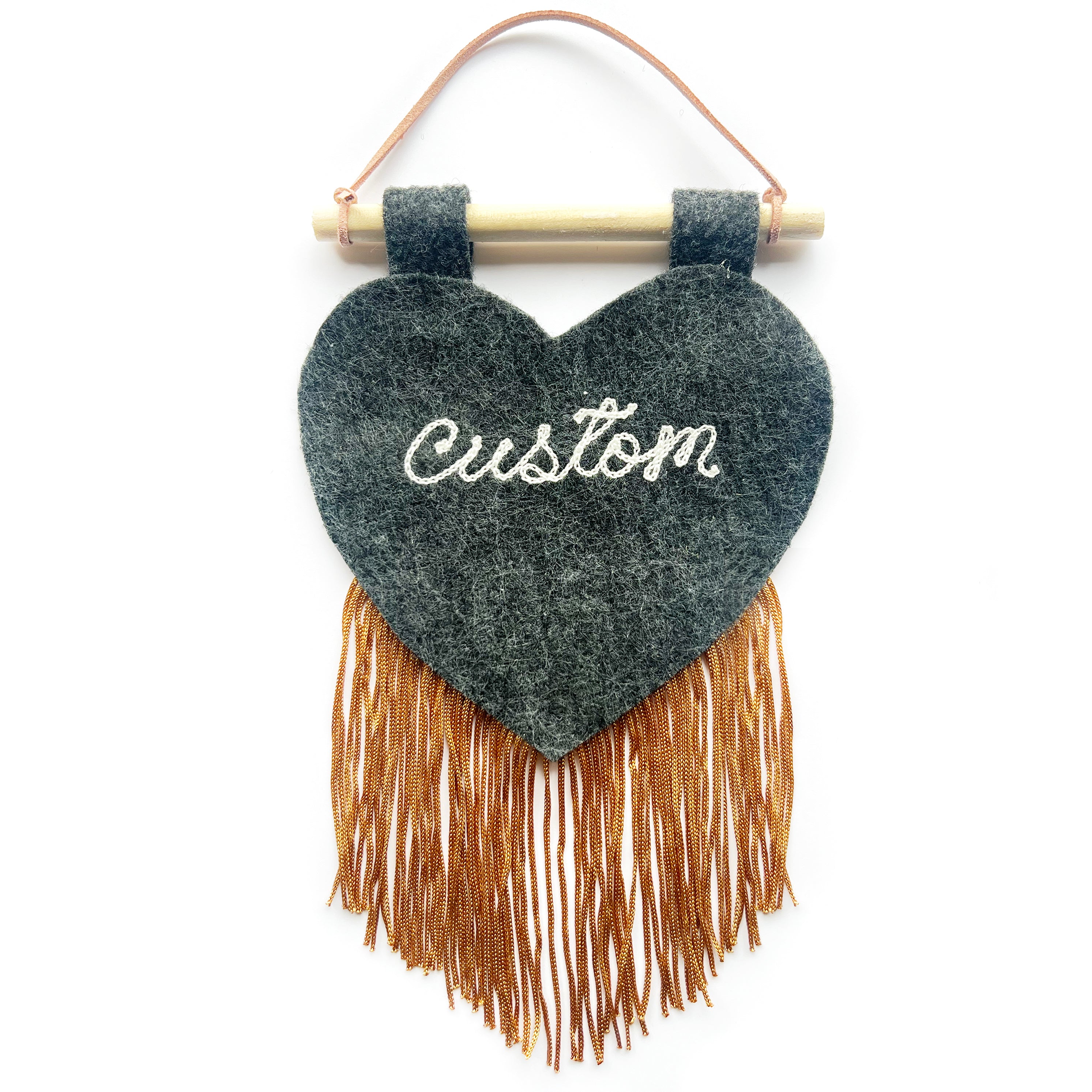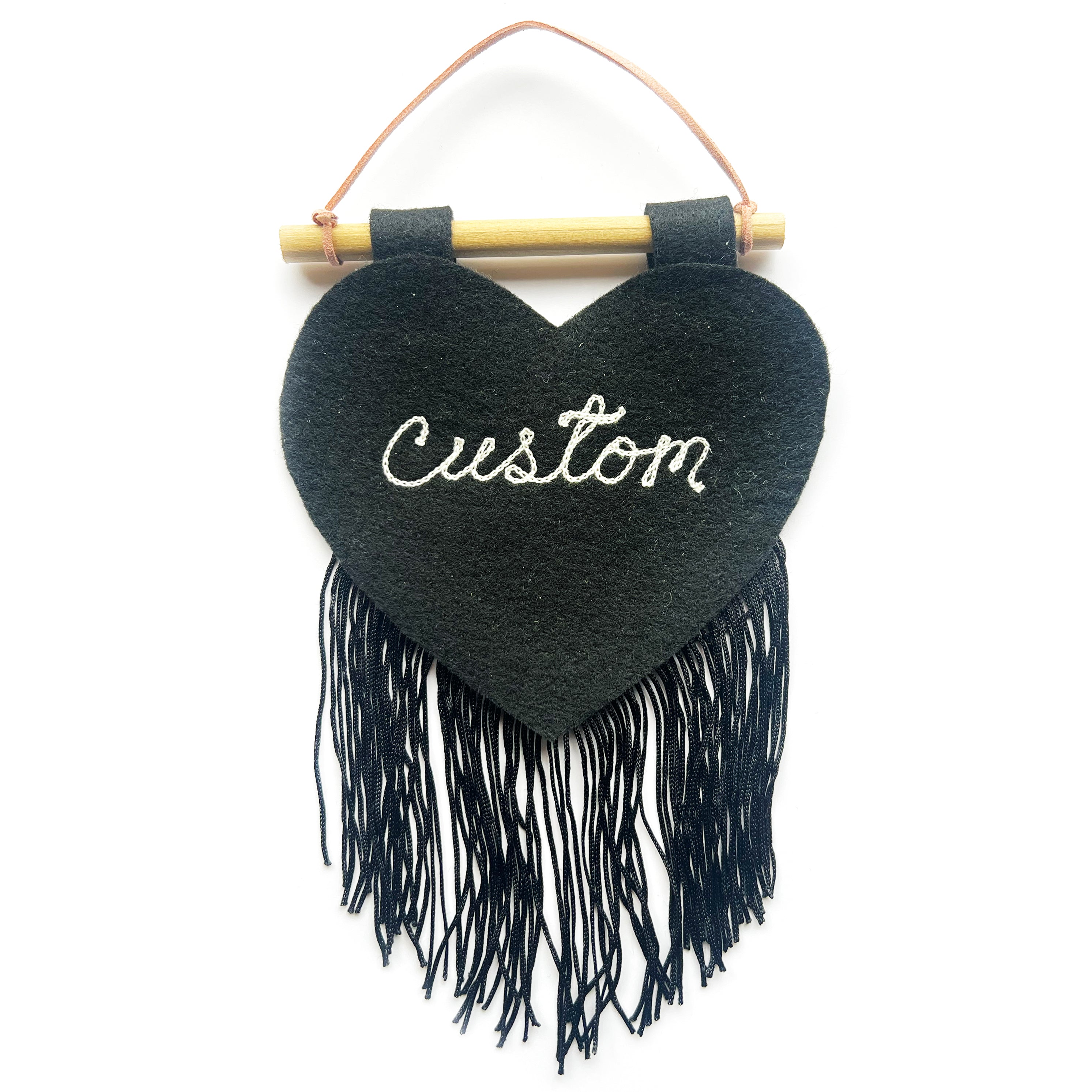 Customizable heart banner that measures around 5x10". They are hand cut-and-sewn out of felt and fringe in-house.