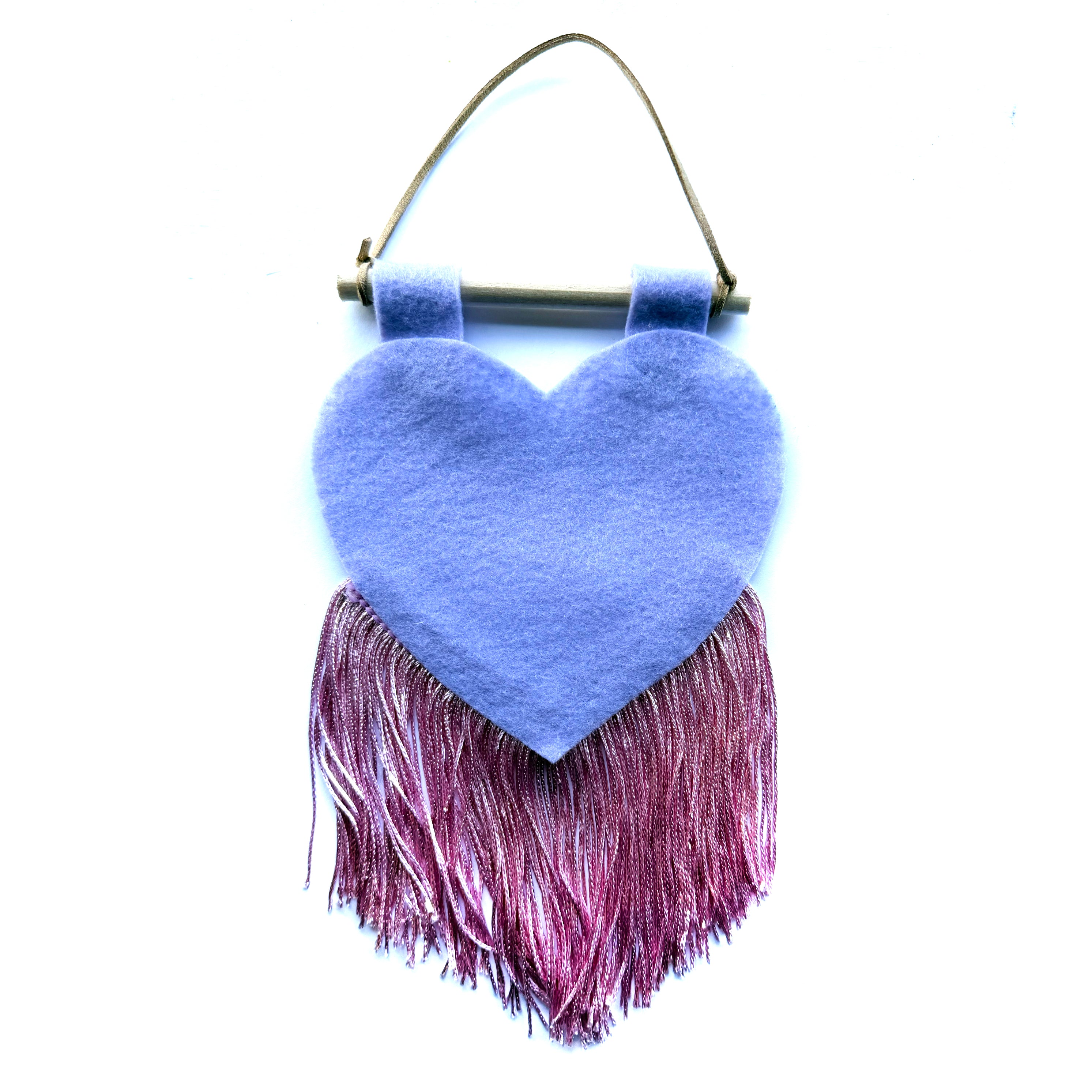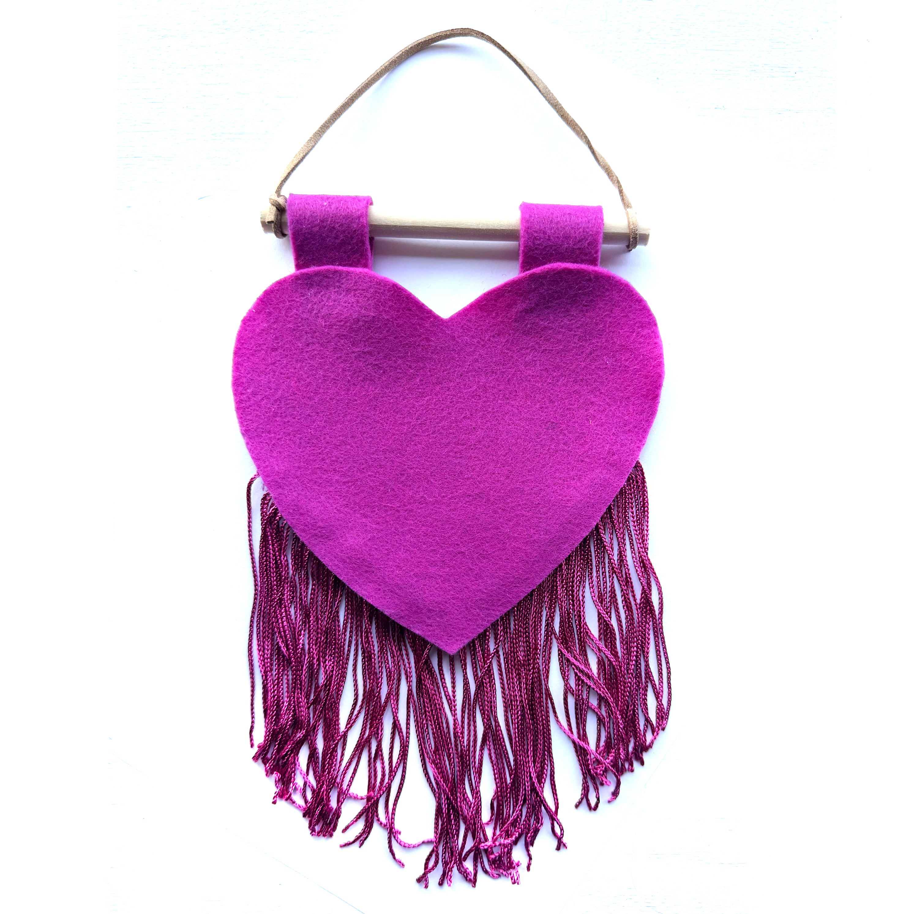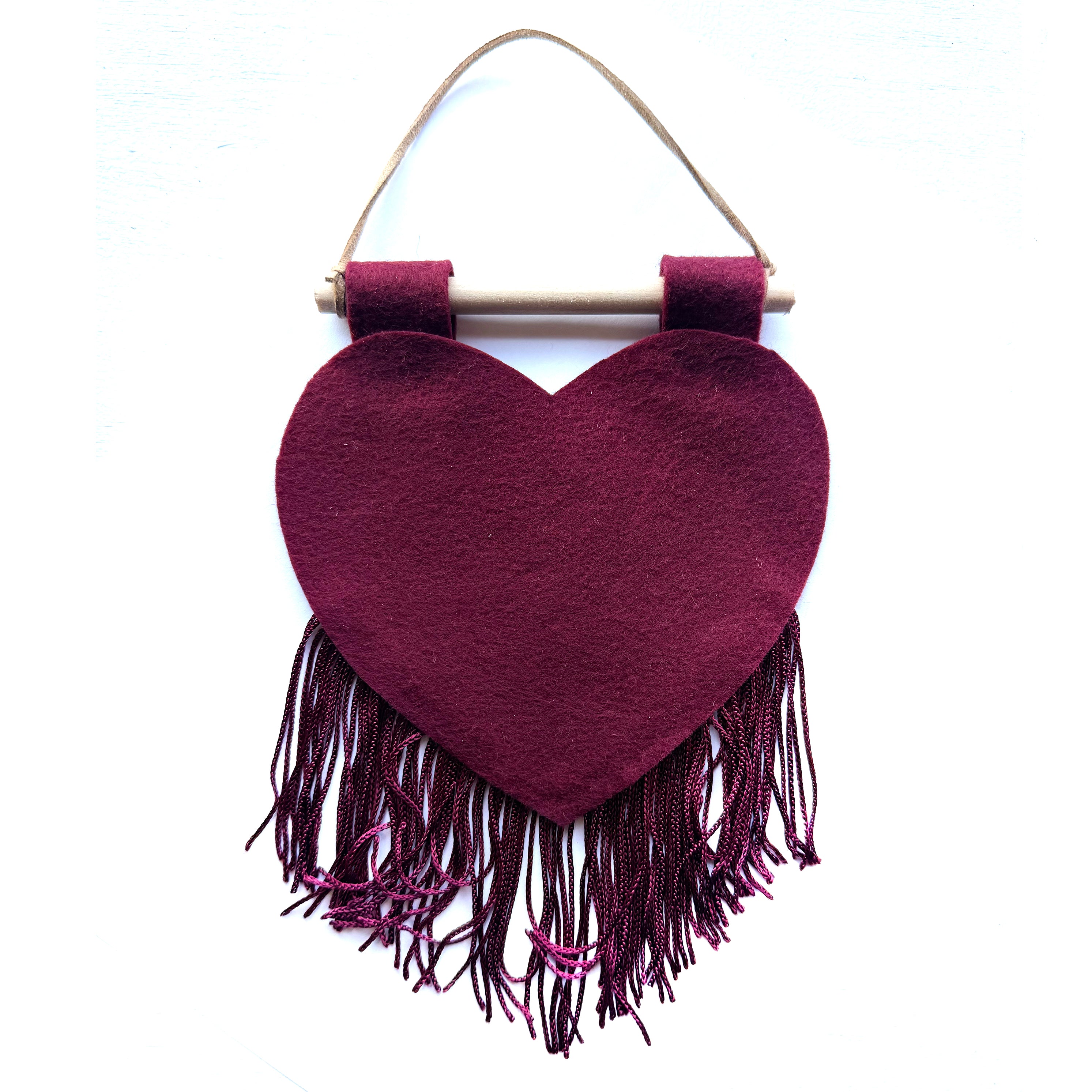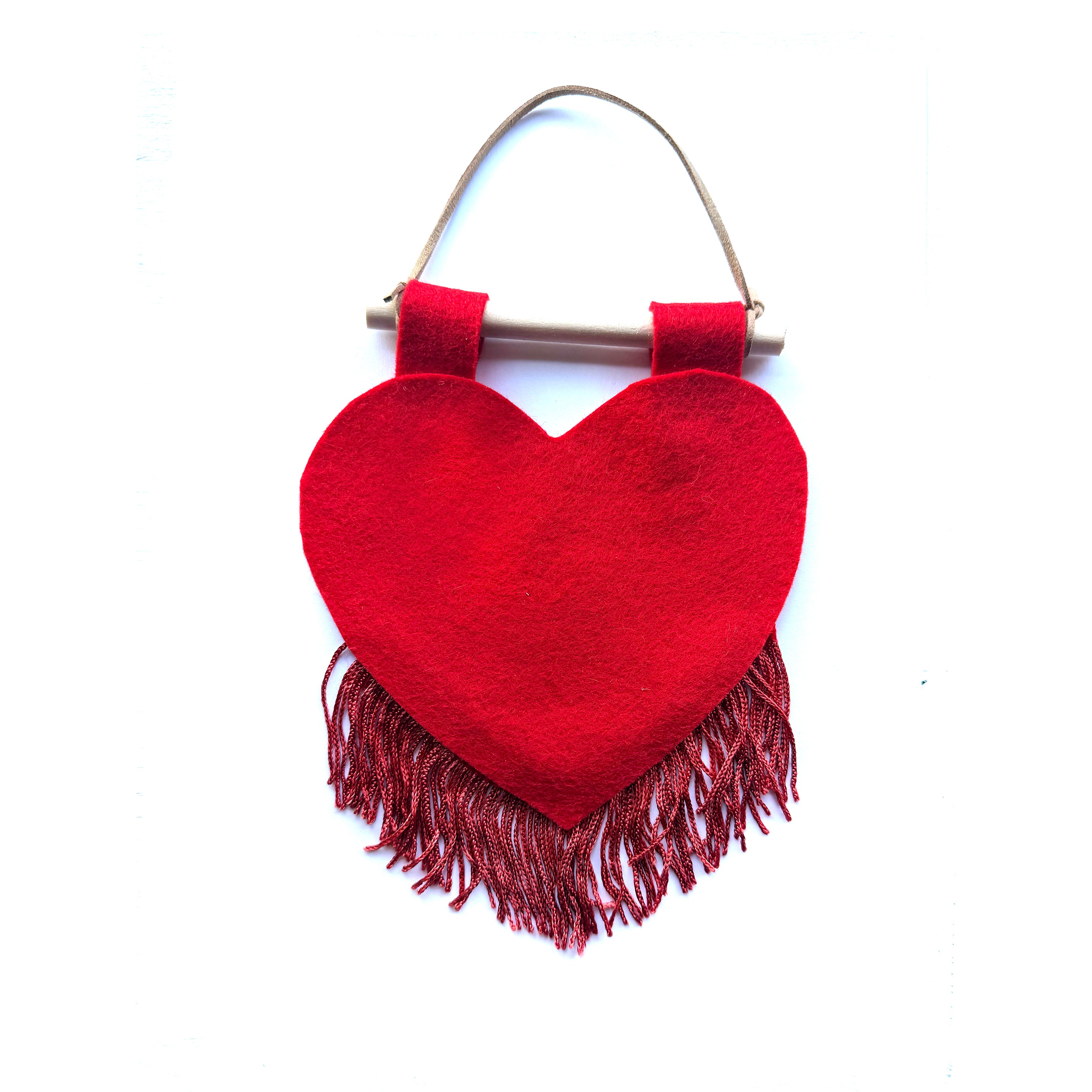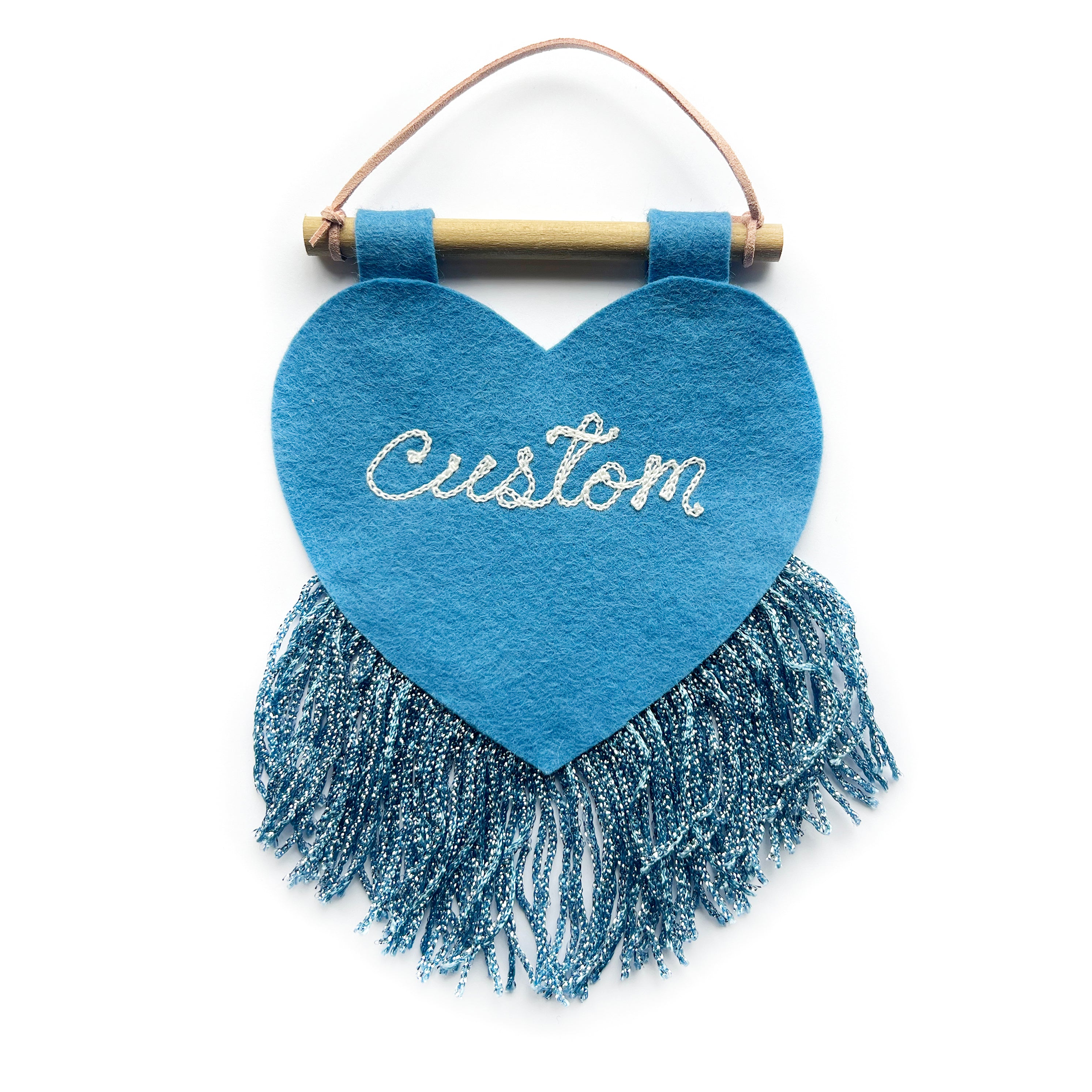 Customizable heart banner that measures around 5x10". They are hand cut-and-sewn out of felt and fringe in-house.